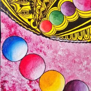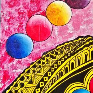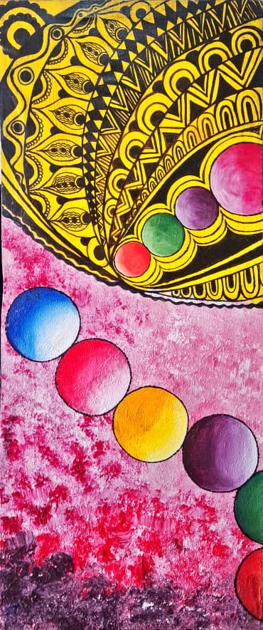Fuchsia a colour born from the 16th century Fuchsia plant made by combining red, purple and pink is used for the matrix of this piece, the intention is to evoke safety, acceptance and love. In some regions fuchsia is a symbol of temperance and patience. The yellow and black patterns are symbolic of the different languages, cultures, religions and countries throughout the world. The coloured balls are used as personification, an indication of people, we are all Different but the same.