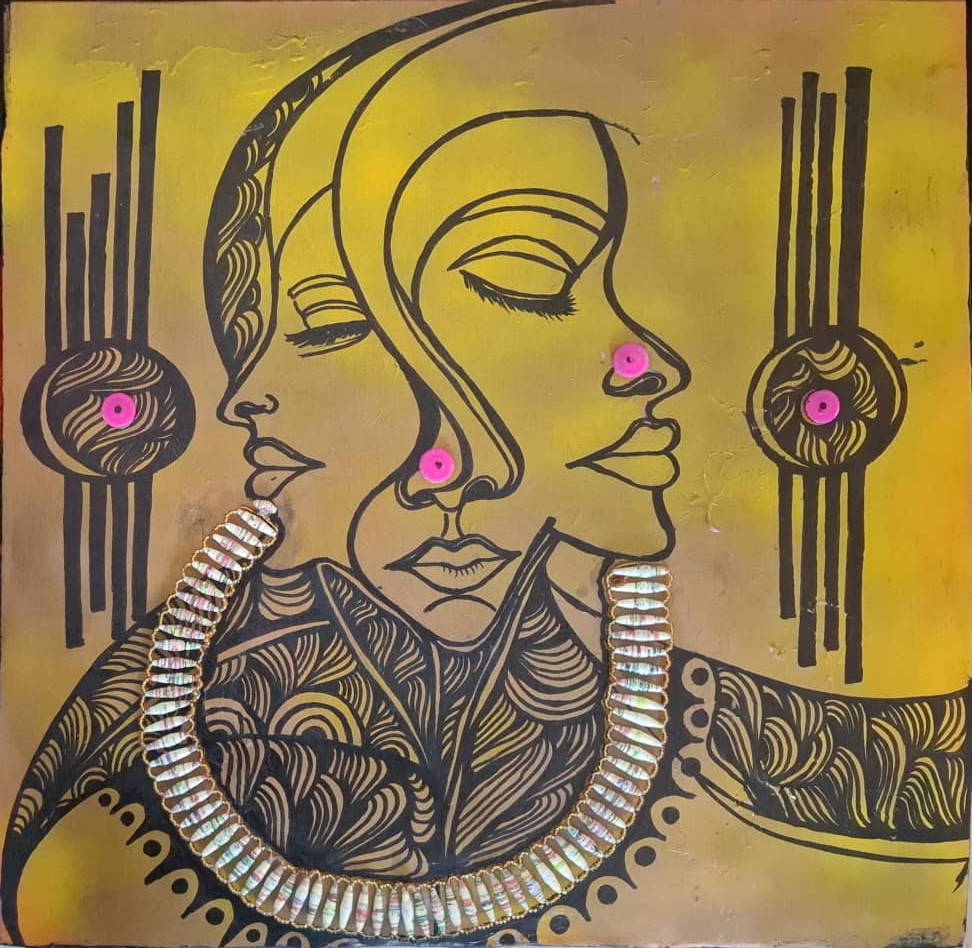 – The artwork depicts three profiles facing each other in a serene, almost mystical setting. The gold background with black patterns evokes a sense of warmth and tradition.
