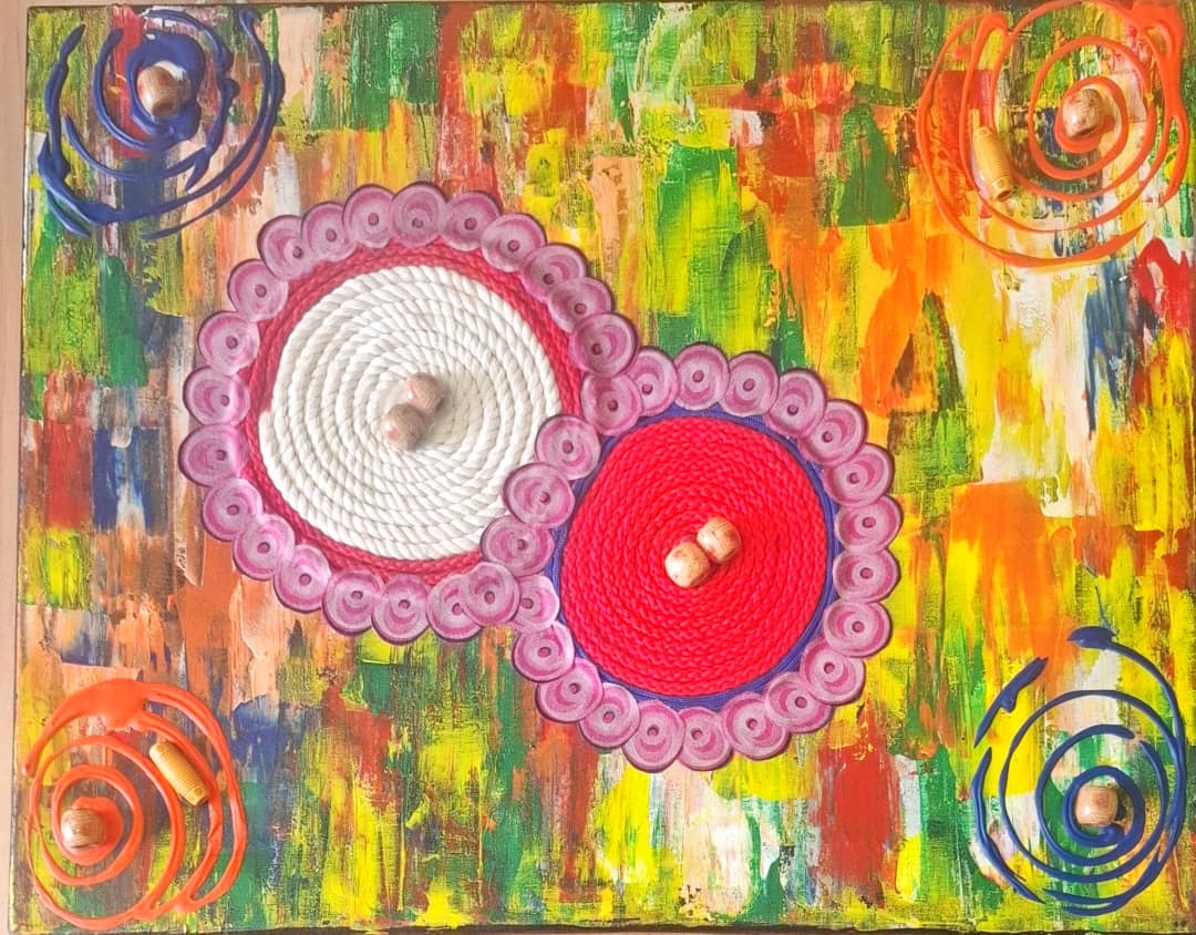 Media: Arcylics, Macrame, Ropes, Wooden beads, (Fabric) Leteisi on Canvas